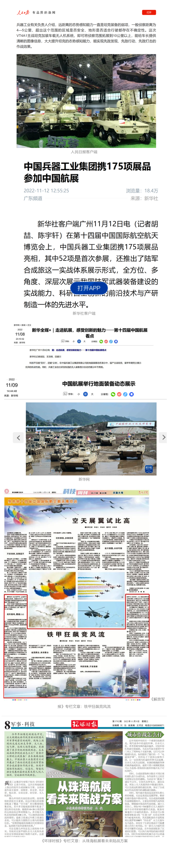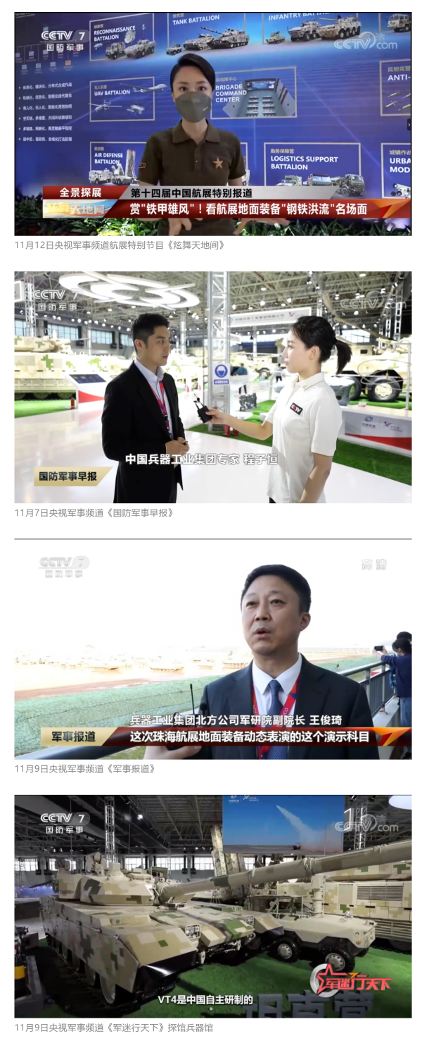 央視國(guó)防軍事頻道航展特別報(bào)道《炫舞天地間》11月12日《賞“鐵甲雄風(fēng)”!看航展地面裝備“鋼鐵洪流”名場(chǎng)面》對(duì)兵器工業(yè)集團(tuán)武器裝備特色亮點(diǎn)進(jìn)行報(bào)道?!秶?guó)防軍事早報(bào)》11月7日推出報(bào)道《第十四屆中國(guó)國(guó)際航空航天博覽會(huì)明天開幕 中國(guó)兵器館首次以陸軍合成旅實(shí)戰(zhàn)體系形式展出》,對(duì)兵器館陸軍合成旅實(shí)戰(zhàn)體系進(jìn)行報(bào)道。《軍事報(bào)道》11月9日推出《第十四屆中國(guó)國(guó)際航空航天博覽會(huì) 地面兵器裝備首次聯(lián)合陸航直升機(jī)進(jìn)行動(dòng)態(tài)展示》報(bào)道。《軍迷行天下》11月9日推出報(bào)道《軍迷打卡航展2022》以專業(yè)軍迷視角探館兵器館,全面展示兵器工業(yè)集團(tuán)參展裝備特色亮點(diǎn)。