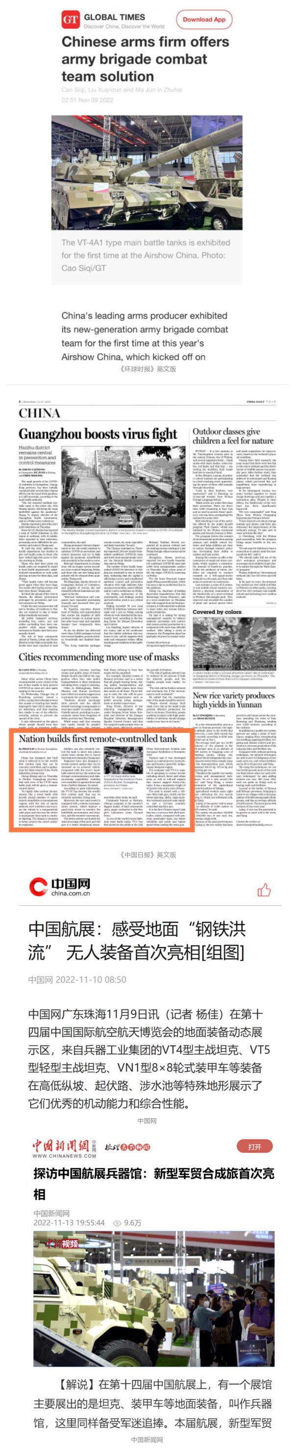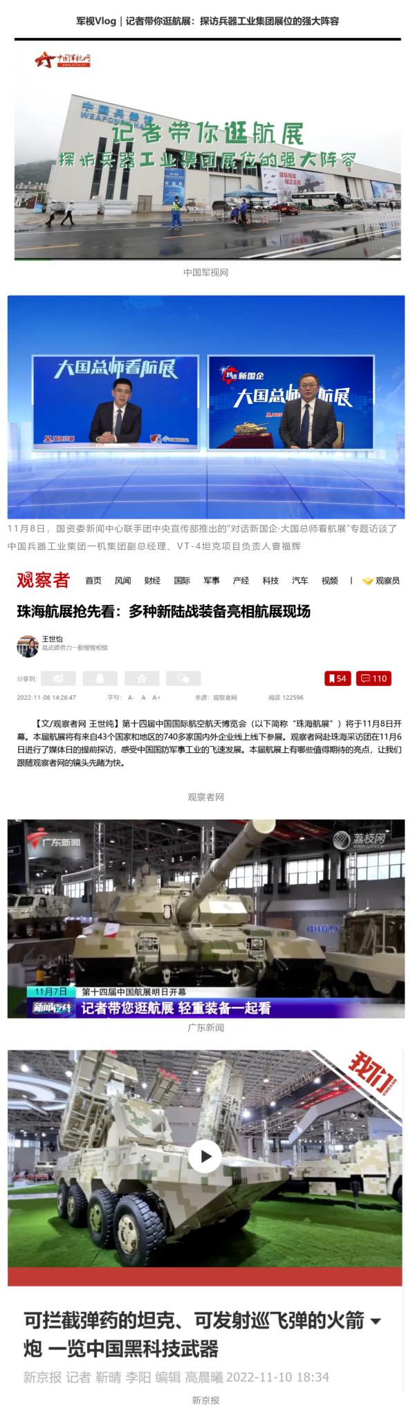 央視國(guó)防軍事頻道航展特別報(bào)道《炫舞天地間》11月12日《賞“鐵甲雄風(fēng)”!看航展地面裝備“鋼鐵洪流”名場(chǎng)面》對(duì)兵器工業(yè)集團(tuán)武器裝備特色亮點(diǎn)進(jìn)行報(bào)道?!秶?guó)防軍事早報(bào)》11月7日推出報(bào)道《第十四屆中國(guó)國(guó)際航空航天博覽會(huì)明天開幕 中國(guó)兵器館首次以陸軍合成旅實(shí)戰(zhàn)體系形式展出》,對(duì)兵器館陸軍合成旅實(shí)戰(zhàn)體系進(jìn)行報(bào)道。《軍事報(bào)道》11月9日推出《第十四屆中國(guó)國(guó)際航空航天博覽會(huì) 地面兵器裝備首次聯(lián)合陸航直升機(jī)進(jìn)行動(dòng)態(tài)展示》報(bào)道。《軍迷行天下》11月9日推出報(bào)道《軍迷打卡航展2022》以專業(yè)軍迷視角探館兵器館,全面展示兵器工業(yè)集團(tuán)參展裝備特色亮點(diǎn)。