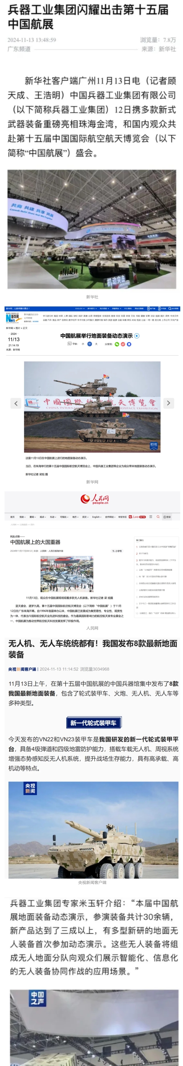 11月12日至17日,第十五屆中國國際航空航天博覽會在廣東省珠海市舉行,中國兵器工業集團有限公司突出數智賦能軍貿合成旅作戰體系,帶來了一系列新產品、新技術、新體系,全方位展示我國陸軍外貿武器裝備發展最高水平、最新突破、最前沿成果,立體化呈現陸域信息化、智能化、體系化作戰能力,受到了全社會廣泛關注。航展期間,央視綜合頻道《新聞聯播》、央視新聞頻道《新聞直播間》《長空鵬程》報道兵器工業集團參展情況,重點介紹了VT4A1主戰坦克、輪式裝甲火炮、新一代陸域指控信息系統、無人戰車、民用無人運輸機及地面裝備演示有關內容。央視新聞推出航展直播節目《藍天之約》,邀請兵器工業集團嘉賓對參展情況、裝備動態演示作了講解。