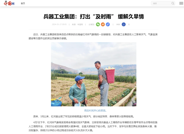 5月27日,中國網(wǎng)刊發(fā)《兵器工業(yè)集團:打出“及時雨” 緩解久旱情》,對中國兵器工業(yè)集團有限公司助力云南省紅河州人工影響天氣、氣象監(jiān)測建設(shè)等方面作出的突出貢獻作了報道。 兵器工業(yè)集團:打出“及時雨” 緩解久旱情 近日,兵器工業(yè)集團收到來自定點幫扶的云南省紅河州氣象局的一封感謝信,對兵器工業(yè)集團在人工影響天氣、氣象監(jiān)測建設(shè)等方面作出的突出貢獻表示感謝。 原來,3月以來,紅河縣出現(xiàn)了罕見的持續(xù)高溫少雨天氣,部分地區(qū)特旱,森林草原火險等級較高。 4月1日下午,紅河州氣象局發(fā)現(xiàn)將會有強對流天氣影響,立即安排兵器造人工增雨作業(yè)車輛前往樂育甲寶作業(yè)點等待實施人工增雨作業(yè),21時20分成功發(fā)射增雨火箭彈4枚,全縣大部地區(qū)下起小雨。當天下午,寶華與樂育交界處突發(fā)森林火情,情況較復(fù)雜,持續(xù)20分鐘的小雨過程成功協(xié)助滅火隊員撲滅火情。