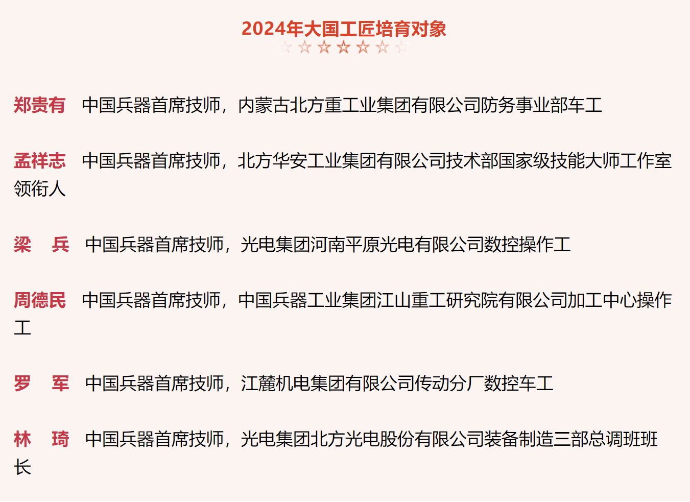 兵器工業集團6名高技能人才入選2024年大國工匠培育對象名單