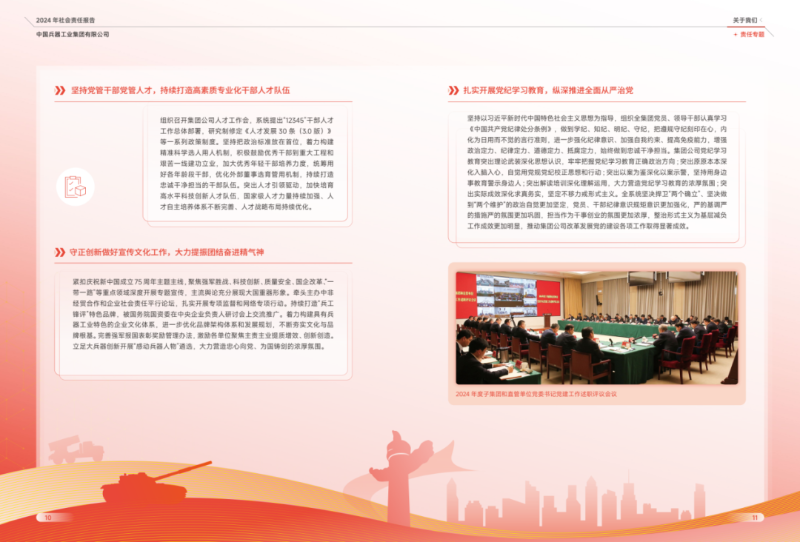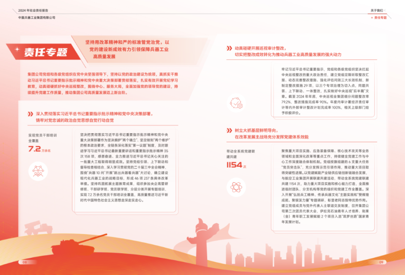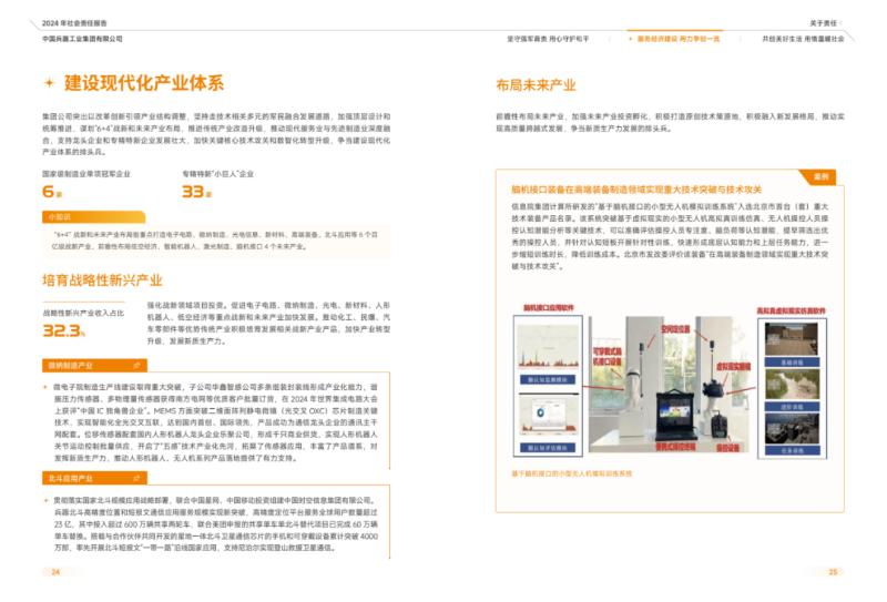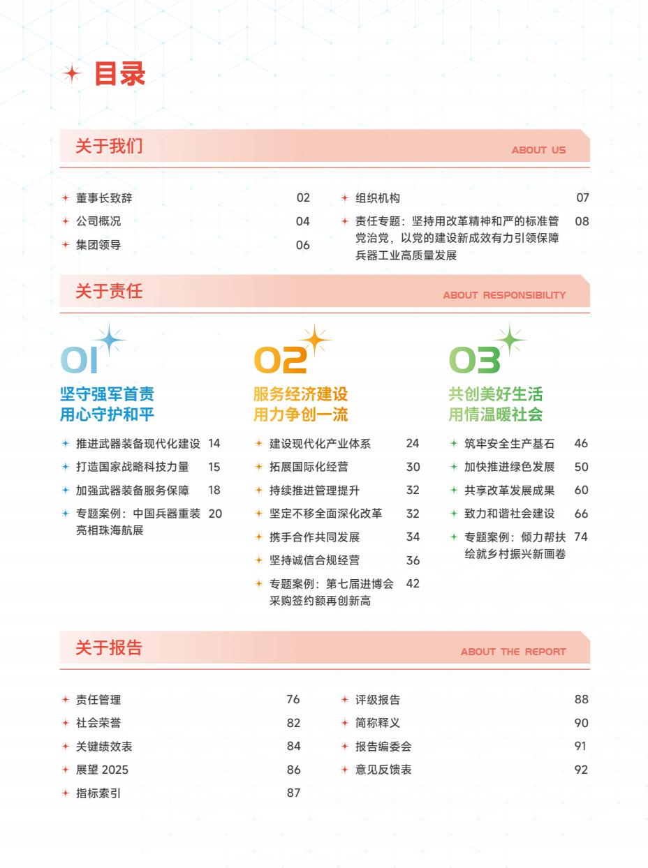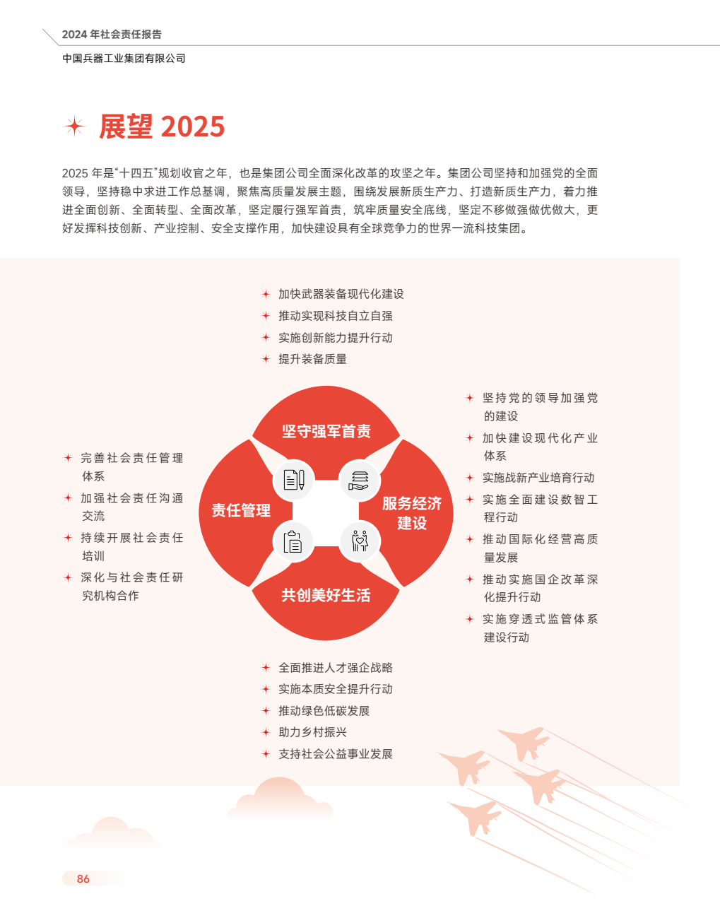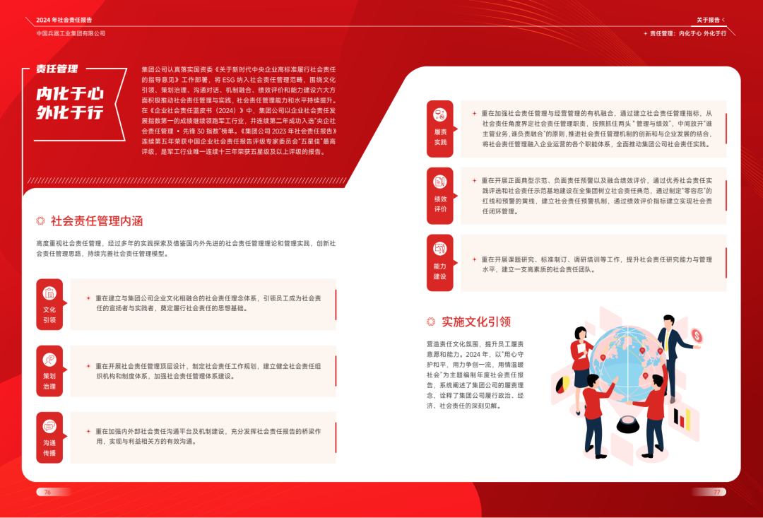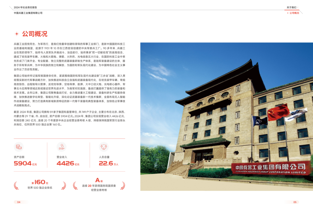 近日,中國兵器工業集團有限公司正式發布《中國兵器工業集團有限公司2024年度社會責任報告》。本次報告是集團公司第16份年度社會責任報告,從堅守強軍首責、服務經濟建設、共創美好生活三個維度,全面展示集團公司履行社會責任的實踐與成效。經中國企業社會責任報告評級專家委員會評定,《報告》獲得“五星佳”最高評級,成為軍工行業唯一一家連續6年獲此殊榮的中央企業。
